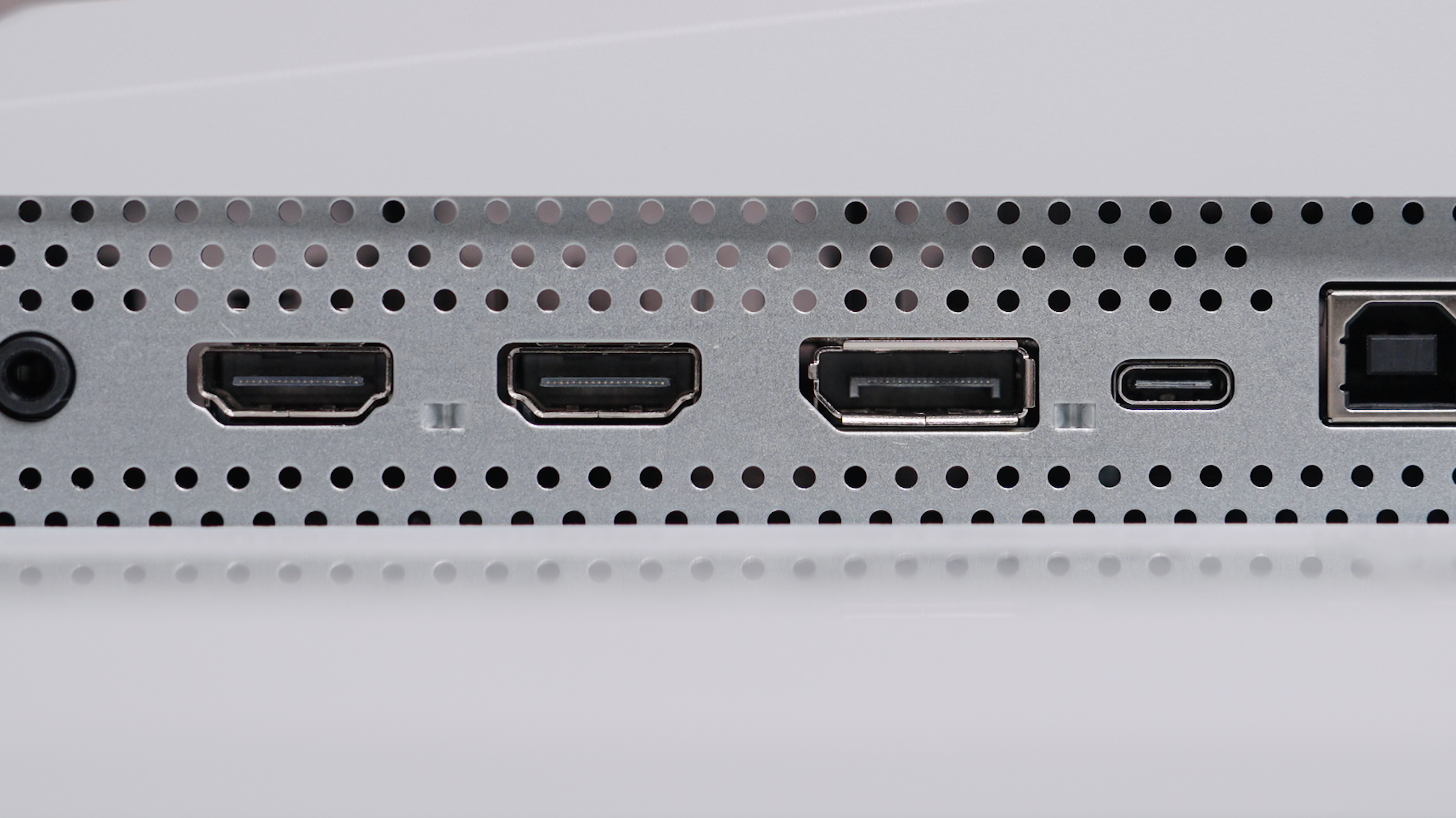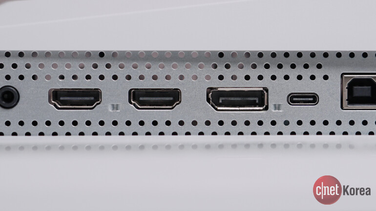 포트 구성도 알차다. HDMI 2.1 2개, DisplayPort 1.4a 1개, USB-C 1개, USB-A 2개, USB-B 1개, 오디오 단자 1개로 이루어져 있다. USB-C 포트는 DP Alt Mode와 최대 90W 전력 공급을 지원해, 노트북은 케이블 하나로 충전과 화면 출력이 동시에 가능하다.
