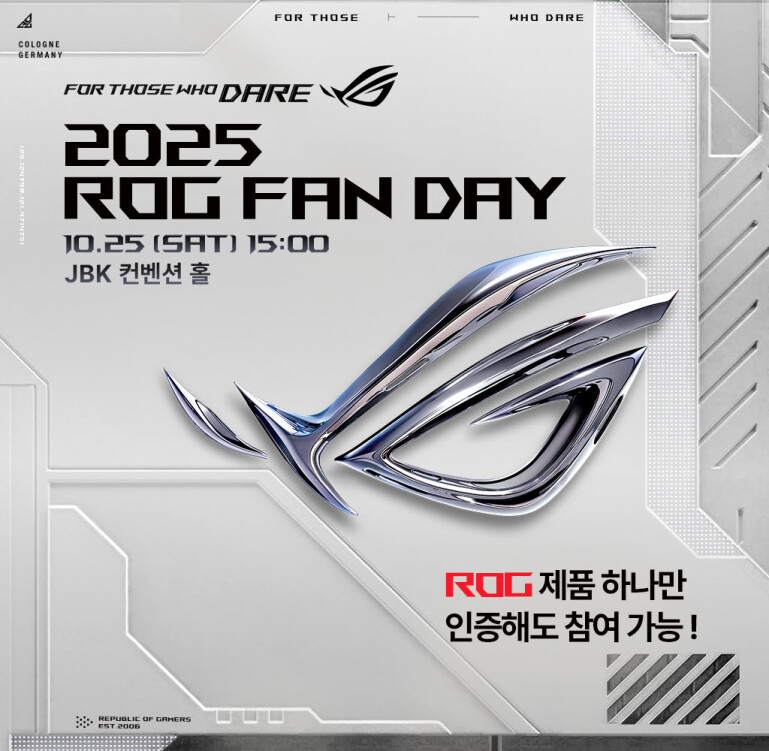 ROG FAN DAY 2025는 에이수스 그래픽카드 30주년을 기념하고 ROG를 사랑하는 유저들과의 만남을 위해 마련된 자리로 10월 25일 오후 3시, 서울 JBK 컨벤션 홀에서 진행된다. ROG의 다양한 하드웨어와 더불어 신제품 전시 및 체험 그리고 다양한 이벤트와 경품이 제공될 예정으로 참가 신청은 에이수스 공식 홈페이지 및 ASUS · ROG SNS 채널을 통해 가능하다.
