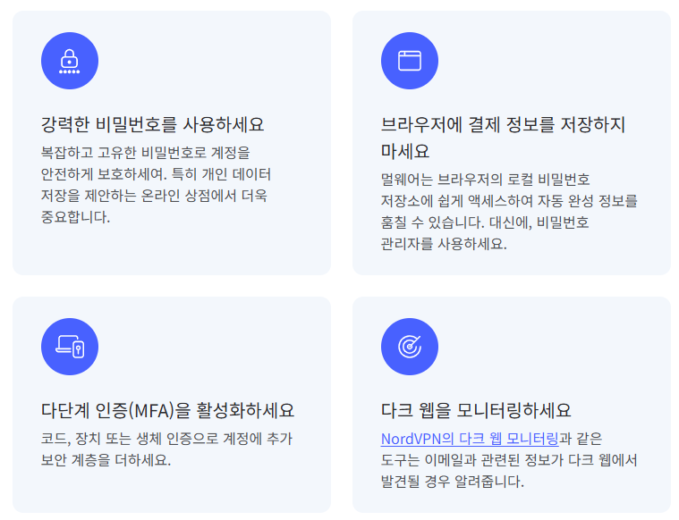 노드VPN은 카드 범죄를 막기 위해 4가지 방법을 제안한다. ▲강력한 비밀번호를 사용 ▲브라우저에 결제 정보를 저장하지 말 것 ▲다단계 인증(MFA) 활성화 ▲다크 웹 모니터링이다.