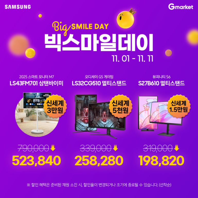 11일까지 진행되는 이번 행사에서는 삼성 모니터들을 최대 22% 할인 혜택으로 만나볼 수 있다. 2025년형 ▲삼성 스마트 모니터 M7 ▲오디세이 G5 게이밍 ▲뷰피니티 S6 모니터 등 다양한 모델이 준비됐다.