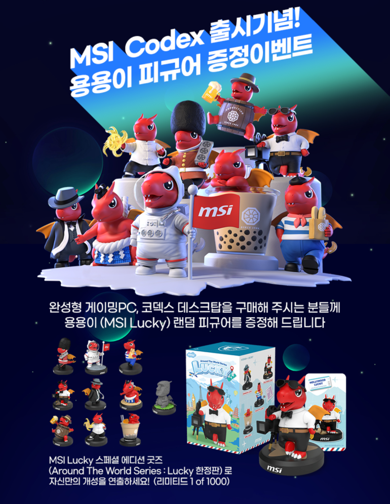 이번 행사는 MSI의 인기 제품군인 데스크탑을 비롯해 다양한 홈·비즈니스 모니터와 게이밍 모니터 등 폭넓은 라인업을 대상으로 진행된다. 특히 데스크탑의 경우, 행사 기간 모델별 최대 30만 원 할인 혜택은 물론 MSI 한정판 랜덤 피규어 ‘용용이(MSI Lucky)’ 증정 이벤트도 함께 마련돼 MSI 팬들의 마음을 확실히 사로잡는다.