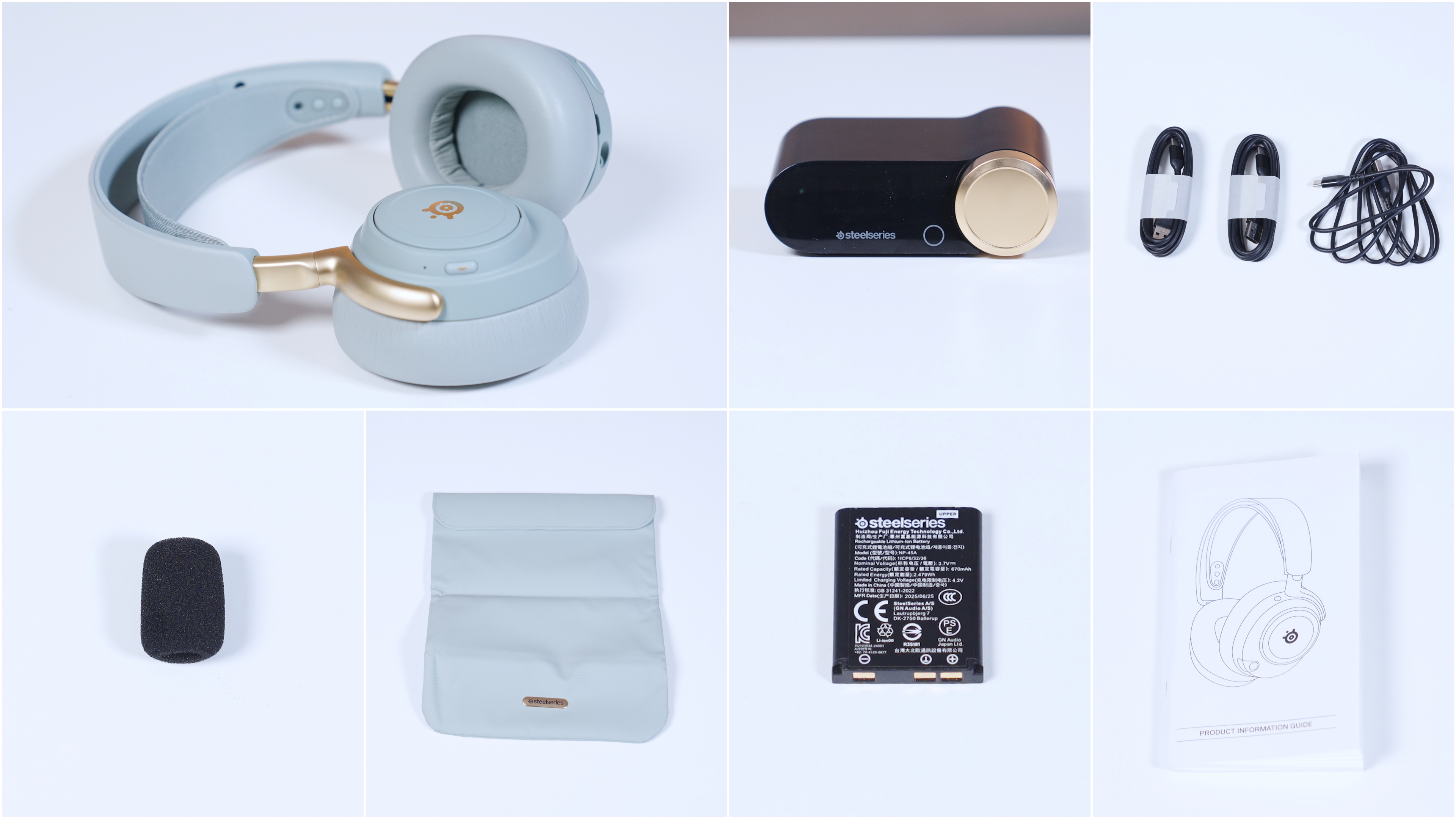 스틸시리즈 아크티스 노바 엘리트는 패키지 디자인부터 남다르다. 블랙과 골드 컬러를 사용해 고급스러운 이미지를 부각시켰다. 겉 패키지를 열면 엘리트라고 쓰인 본 박스가 나오는 형태로 이 것을 열면 아크티스 노바 엘리트 헤드셋 본체, 다기능을 담은 GameHub, USB C to A 케이블 3개, 마이크 부착용 팝 필터, 헤드셋 보관 파우치, 추가 배터리, 사용자 메뉴얼이 들어있는 구성이다.