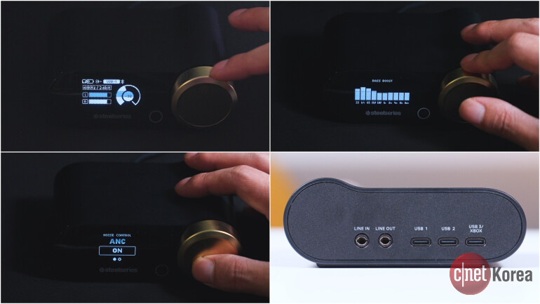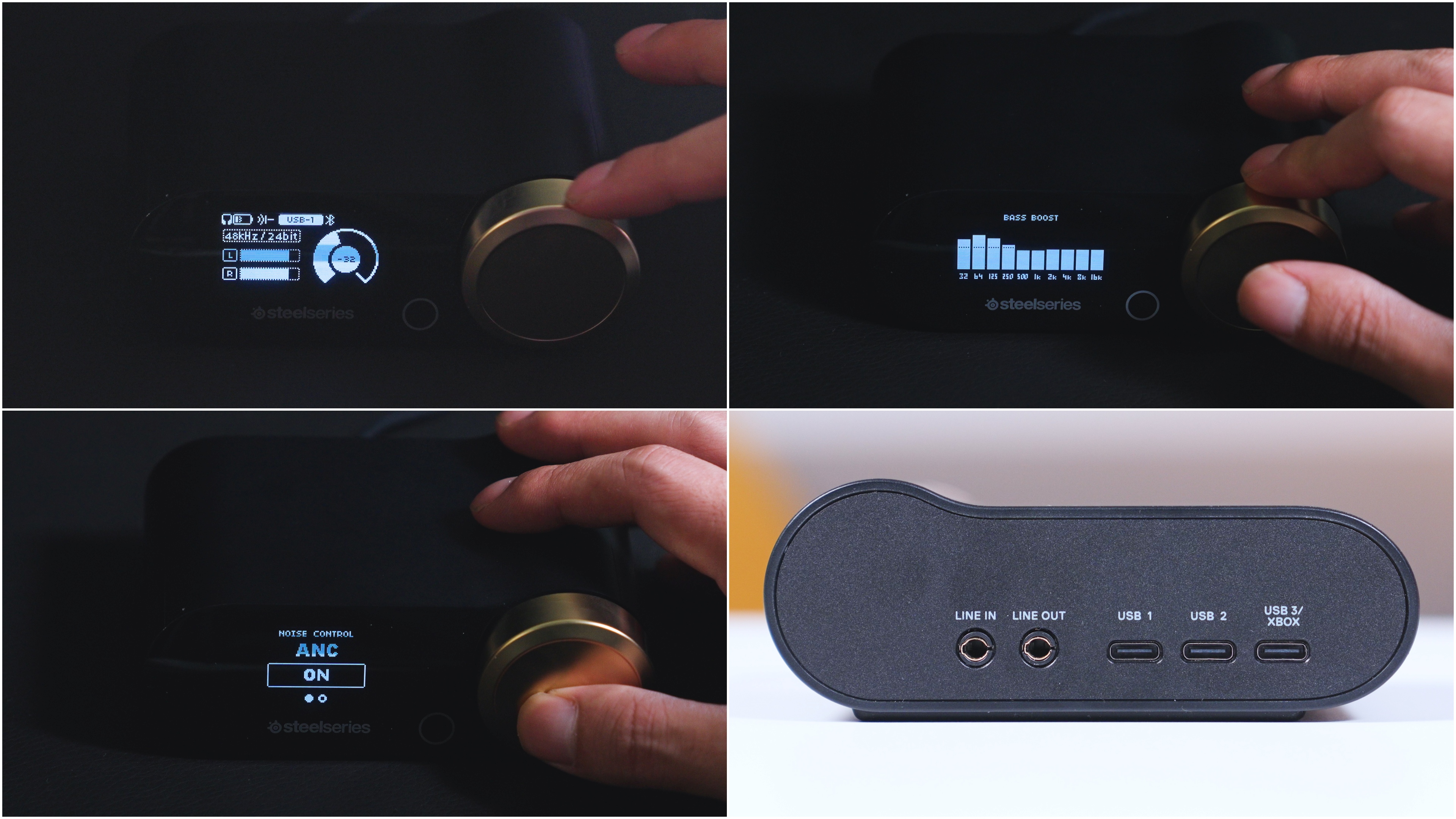 패키지에 함께 제공되는 GameHub는 볼륨 조절을 비롯해서 챗믹스 관련 기능들, 사운드 이퀄라이저, 액티브 노이즈 캔슬링 및 디바이스 페어링 등 다양한 기능을 제공하며 이름 그대로 허브 역할을 톡톡히 해낸다. 특히 주목할 점은 과거 GameHub와 달리 뒷면에 연결 포트가 케이블 인/아웃, USB-C 포트가 3개로 늘어났다. 그래서 PC를 비롯해 플레이스테이션 5나 엑스박스, 스위치 2와 같은 다양한 게임 콘솔을 한꺼번에 연결해두고 자유롭게 넘나들 수 있다.