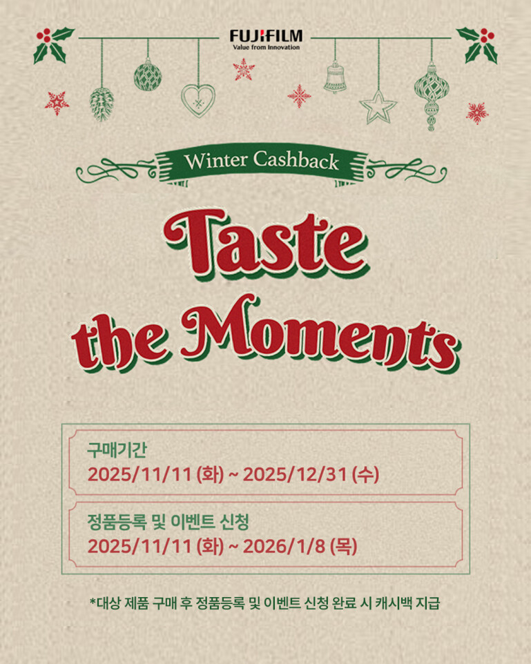 프로모션에 참여하려면 12월 31일까지 후지필름 공식 판매처에서 제품 구매 후 내년 1월 8일까지 정품 등록 및 이벤트 신청을 완료하면 된다. 캐시백 금액은 10만 원부터 최대 65만 원까지 제품별로 상이하며, 자세한 내용은 후지필름 코리아 공식 홈페이지를 통해 확인할 수 있다.