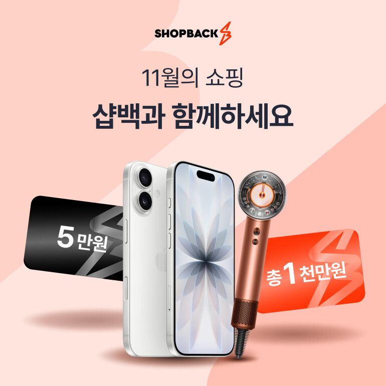 첫째, 샵백코리아는 11월 7일부터 14일까지 일주일간 10만 원 이상 구매 고객을 대상으로 다양한 경품을 제공하는 ‘11.11 쇼핑 페스타’ 이벤트를 진행한다. 샵백 앱에서 챌린지 시작 이후 샵백을 경유해 제휴 스토어에서 10만 원 이상 결제 시 다채로운 경품 응모권이 증정된다. 경품은 아이폰17(1명), 다이슨 슈퍼소닉 뉴럴 헤어드라이어(1명), 스타벅스 1만 원 교환권(10명), 1천원 보너스 캐시백(1000명)으로 준비되어 있으며 추첨을 통해 지급된다. 보다 자세한 사항은 이벤트 페이지에서 확인할 수 있다.