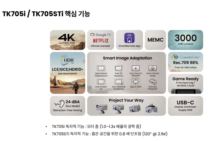 이날 함께 공개된 TK705STi는 보다 짧은 투사거리를 가진 제품으로, 모델명에 보이는 ST는 Short-Through를 의미한다. TK705i가 100인치 화면을 투사하려면 2.2~2.9m 거리가 필요한데 비해서 TK705STi는 1.8m 거리만 확보하면 100인치 화면을 구현할 수 있어 공간 확보에 유리한 특징이 있다.