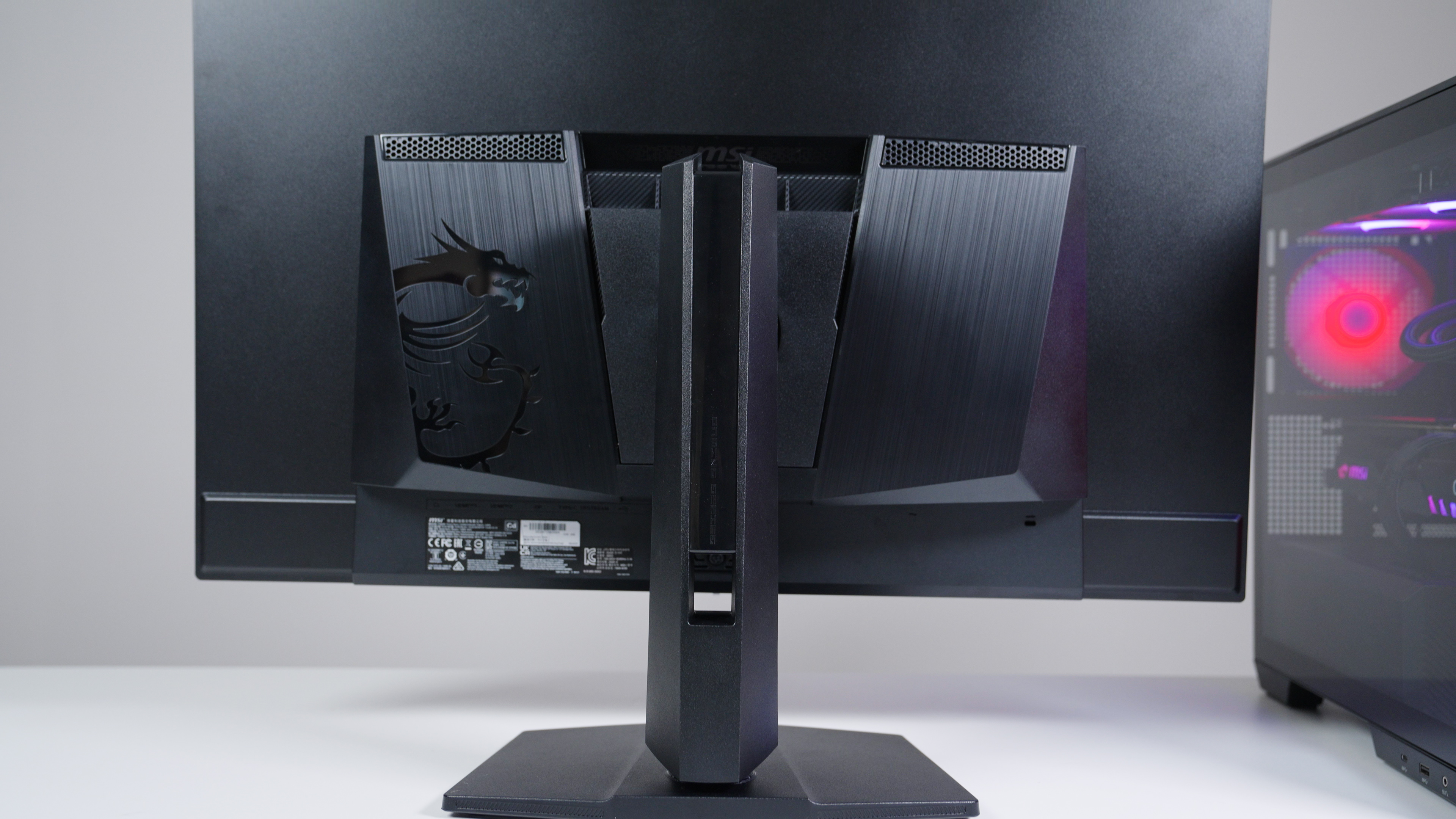 외관은 MSI의 상위 라인업인 MPG 시리즈의 디자인 언어를 따랐다. 후면에는 RGB LED 라이팅과 드래곤 로고를 배치해 심미성을 높였으며, 스탠드는 -5도에서 15도까지 틸트, 최대 110mm 엘리베이션, 좌우 30도 스위블 기능을 지원해 사용자 환경에 따른 위치 조절이 용이하다. 또한 화면 반사를 줄여주는 안티 리플렉션 처리가 되어 있어 실내 조명 간섭을 줄였다.