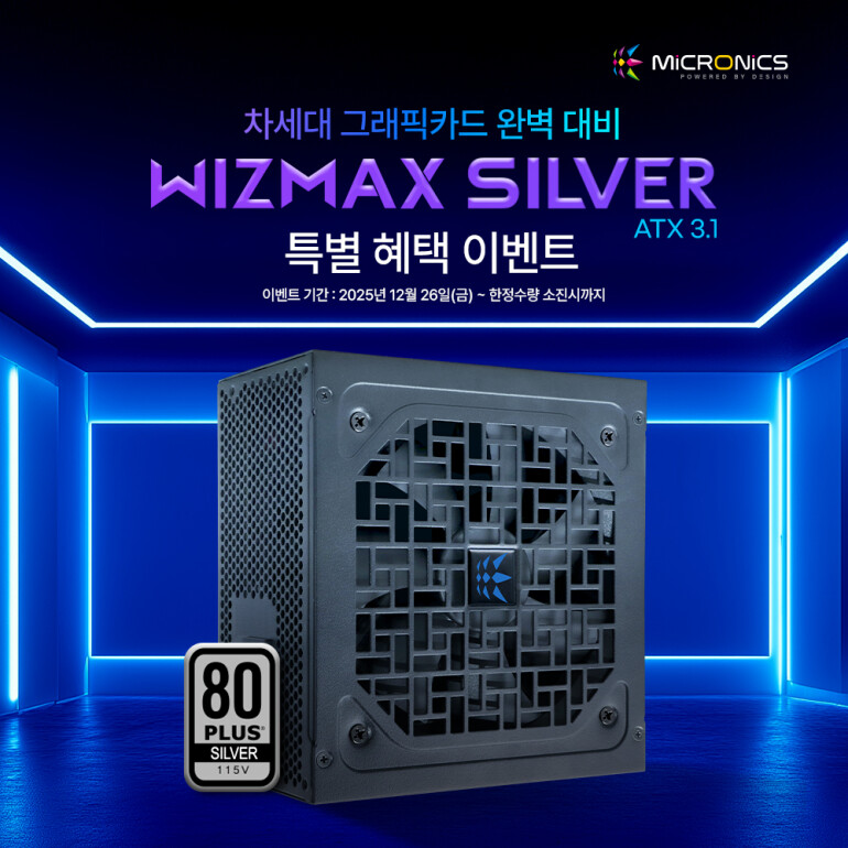 이번 행사는 2025년 12월 26일부터 한정 수량 소진 시까지 운영된다. 행사 기간 동안 WIZMAX 750W 80PLUS 실버 ATX 3.1은 8만9천900 원, WIZMAX 850W 80PLUS 실버 ATX 3.1은 10만9천900 원의 혜택가로 제공된다.