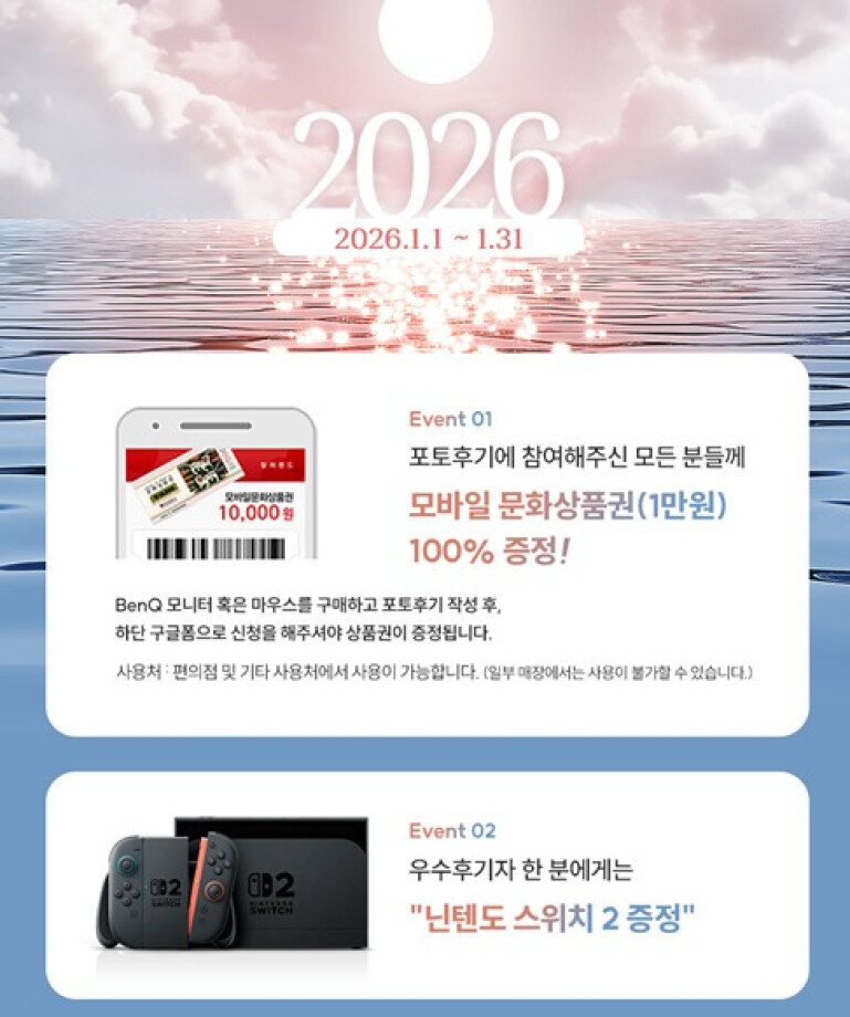 병오년 새해를 맞이하여 진행하는 이번 이벤트는 1월 한 달 간 벤큐 모니터 또는 마우스를 구입하고 포토후기를 작성한 뒤, 구글폼으로 신청한 모든 분들에게 모바일 문화상품권(1만 원권)을 증정하고, 우수 후기자 1명에게는 ‘닌텐도 스위치 2’를 추가로 증정하는 행사이다.