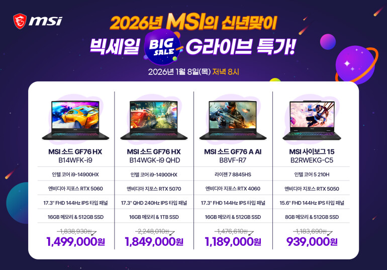 이번 라이브 방송을 통해 ▲소드 GF76 HX B14WFK-i9 ▲소드 GF76 HX B14WGK-i9 QHD ▲소드 GF76 A AI B8VF-R7 ▲사이보그 15 B2RWEKG-C5 등 총 4종의 인기 게이밍 노트북을 선보인다. '소드 GF76 HX' 2종은 인텔 코어 i9 프로세서와 RTX 50 시리즈 그래픽을 기반으로 대화면에서 안정적인 고성능 게이밍 환경을 제공하며, 베스트셀러 모델인 '소드 GF76 A AI'는 AMD 라이젠 7 프로세서를 통해 성능과 실용성의 균형을 강화했다. 대학생에게 인기 높은 '사이보그 15'는 가볍고 세련된 디자인에 RTX 그래픽을 더해 합리적인 가격대의 게이밍 노트북으로 제시된다.