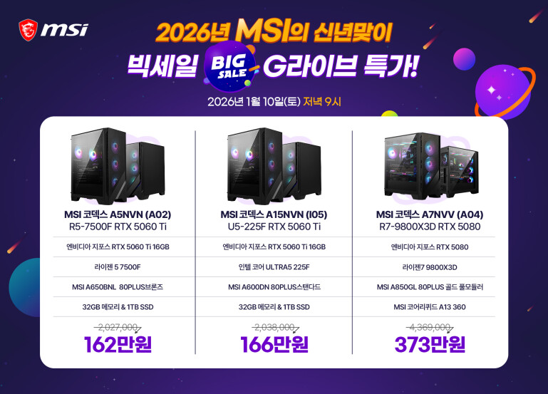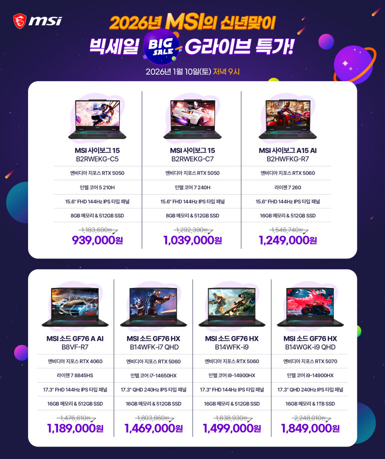 특히 MSI 베스트셀러 모델인 '소드 GF76 A AI'는 메모리 및 SSD 가격 상승으로 노트북 시장 전반의 가격 부담이 커진 상황 속에서, 마지막 재고 한정 클리어런스 세일로 진행돼 이번 라이브 방송에서만 만나볼 수 있는 놓칠 수 없는 구매 기회로 주목된다.