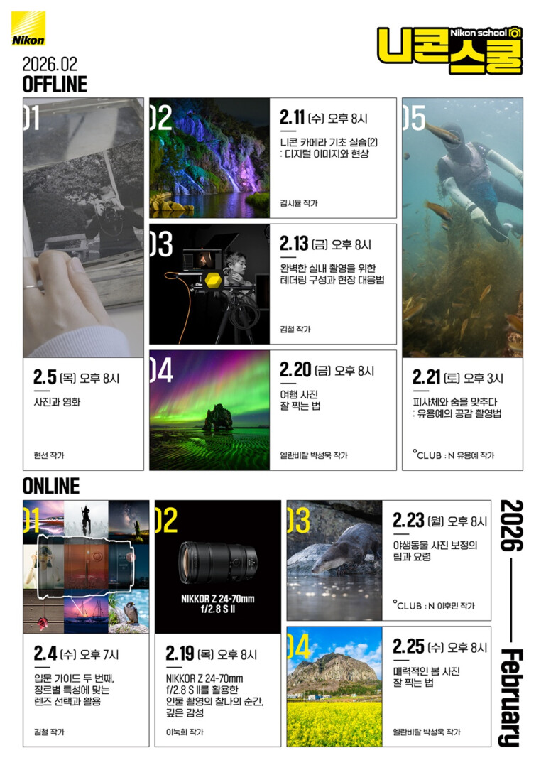 (씨넷코리아=윤현종 기자) 광학기기 전문기업 니콘이미징코리아가 2026년 2월 온오프라인 니콘스쿨 총 9개 강의를 공개했다.