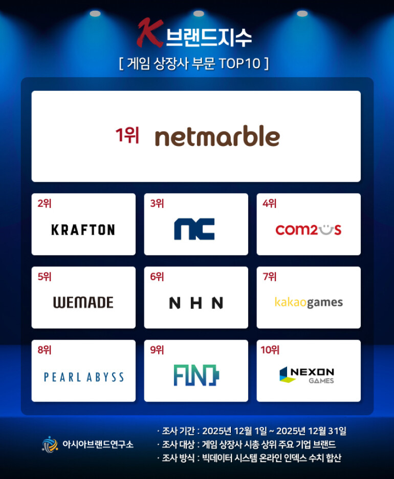 한정근 아시아브랜드연구소 대표는 “이번 K-브랜드지수 게임 상장사 부문은 넷마블이 ]브랜드 파워를 입증한 가운데, 크래프톤이 엔씨소프트를 제치고 2위로 올라서며 주목받고 있다. 이는 단일 게임 IP의 의존도를 넘어 글로벌 시장에서의 확장성과 장르 다변화 성과가 빅데이터 평판에 직접적인 영향을 미치고 있음을 시사한다"고 분석했다.