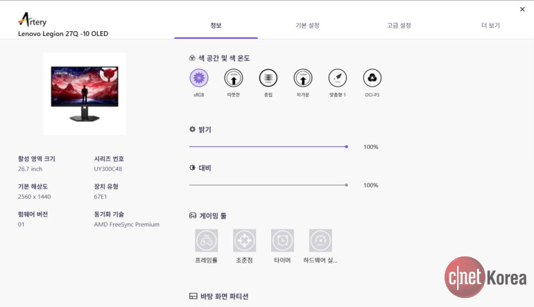 27Q-10 OLED는 실제로 사용하기도 굉장히 편한 모니터다. 리전 모니터 전용 소프트웨어인 LADM(Lenovo Accessories and Display Manager)를 통해서 모니터의 모든 설정을 할 수 있었다. 기본적으로 활성 영역 크기, 해상도, 동기화 기술 등 다양한 내용들을 제공하고, 기본 설정이라고 할 수 있는 밝기부터 대비, 게이밍 툴 ON/OFF 기능까지 지원한다.