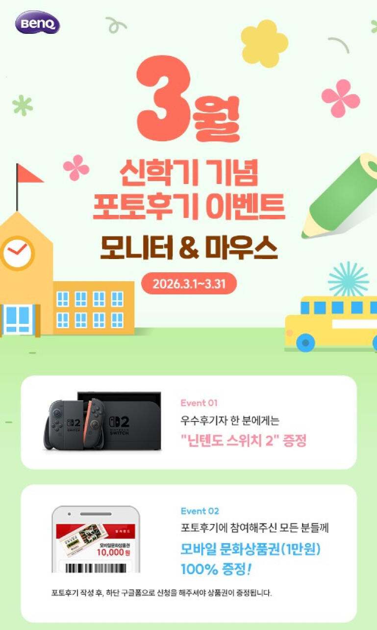 신학기와 함께 새로운 목표를 시작하는 학생과 직장인들을 응원하기 위해 마련된 이번 이벤트는 3월 한 달 간 벤큐 모니터 또는 마우스를 구입하고 포토후기를 작성한 뒤, 구글폼으로 신청한 모든 분들에게 모바일 문화상품권(1만 원권)을 증정하고, 우수 후기자 한 명에게는 닌텐도 스위치 2’를 추가로 증정하는 행사이다.