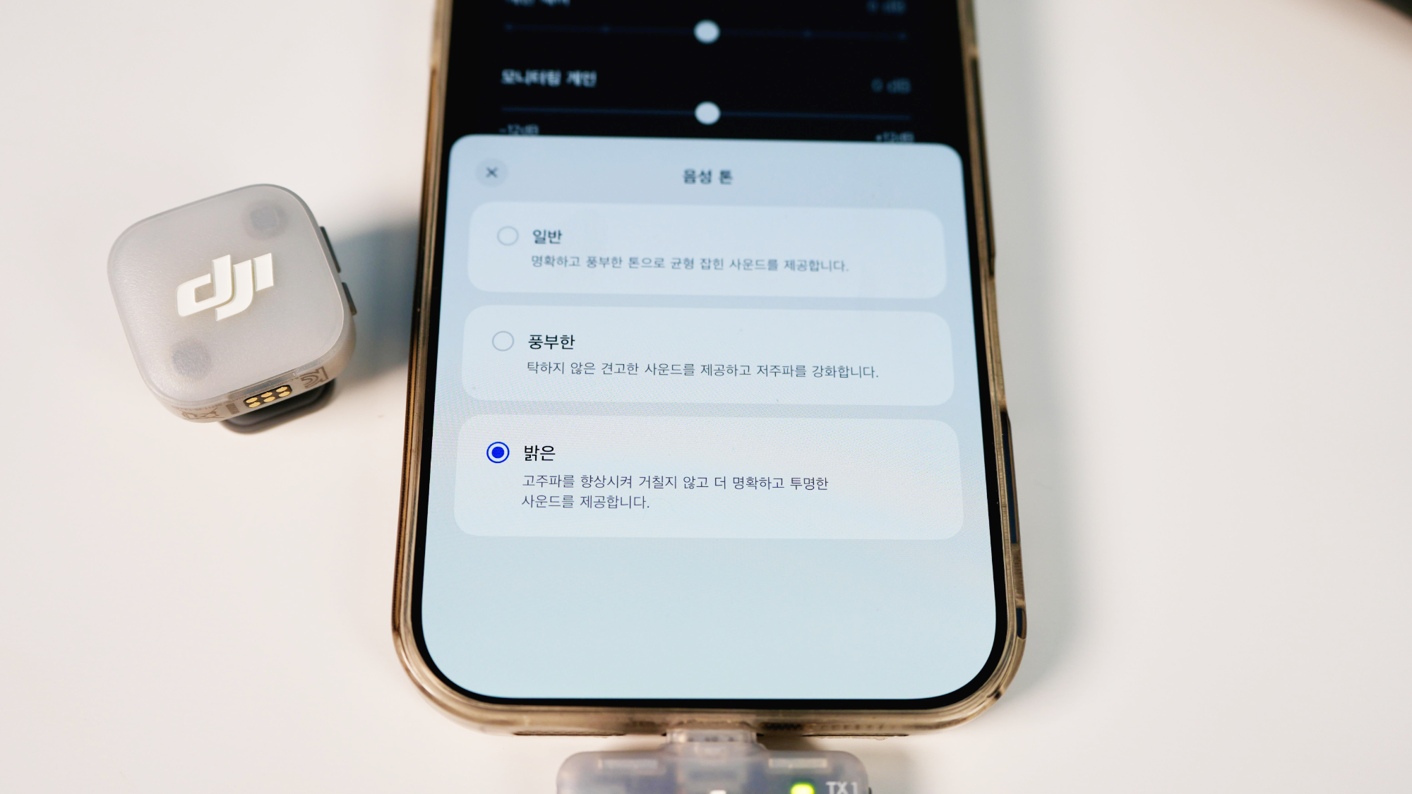 사용자는 DJI Mimo 앱에서 일반/풍부한(Rich)/밝은(Bright) 세 가지 음성 톤을 선택할 수 있다. 일반은 자연스러운 원음에 가깝고 풍부한 세팅은 중저음을 강조, 보이스오버나 팟캐스트 스타일 목소리를 원할 때 유용하다. 밝은 세팅은 고역대를 살려 발화음을 또렷하게 만들어준다.